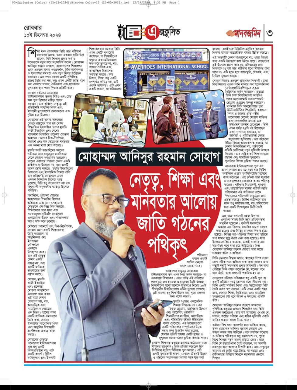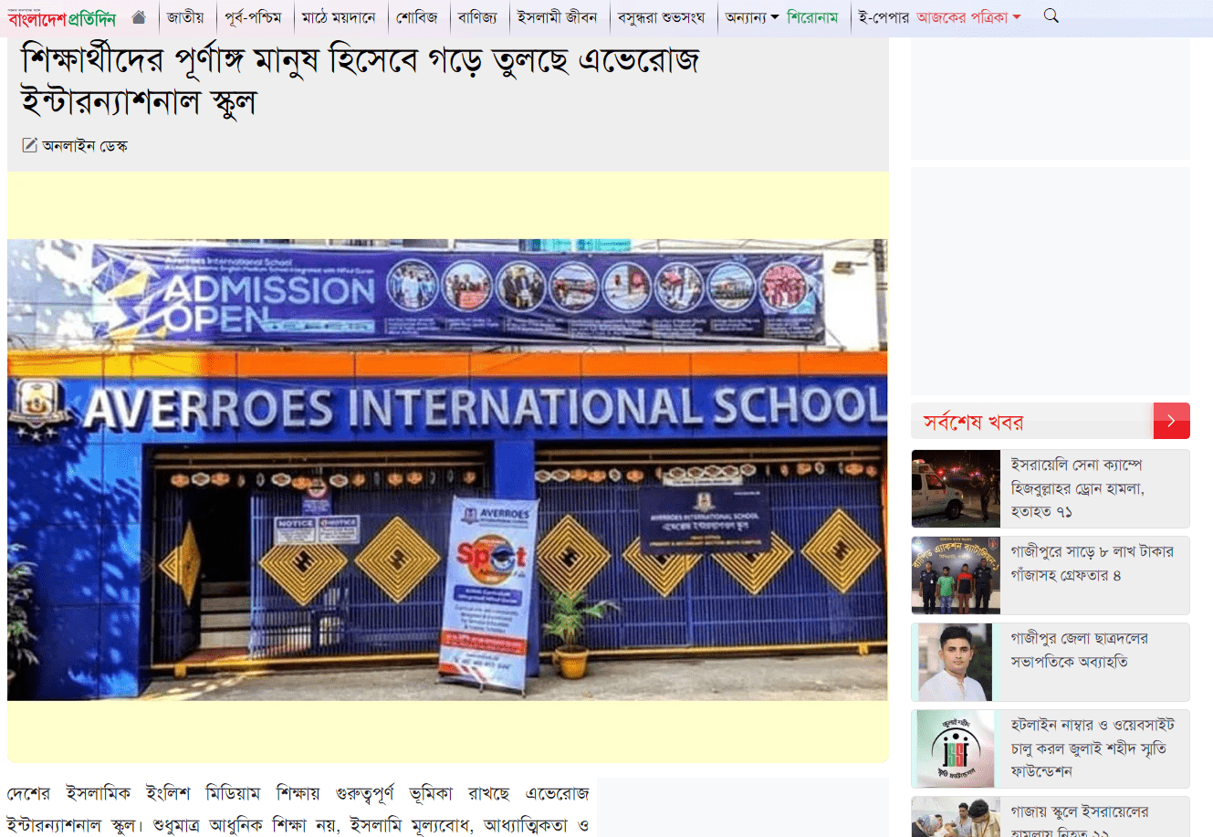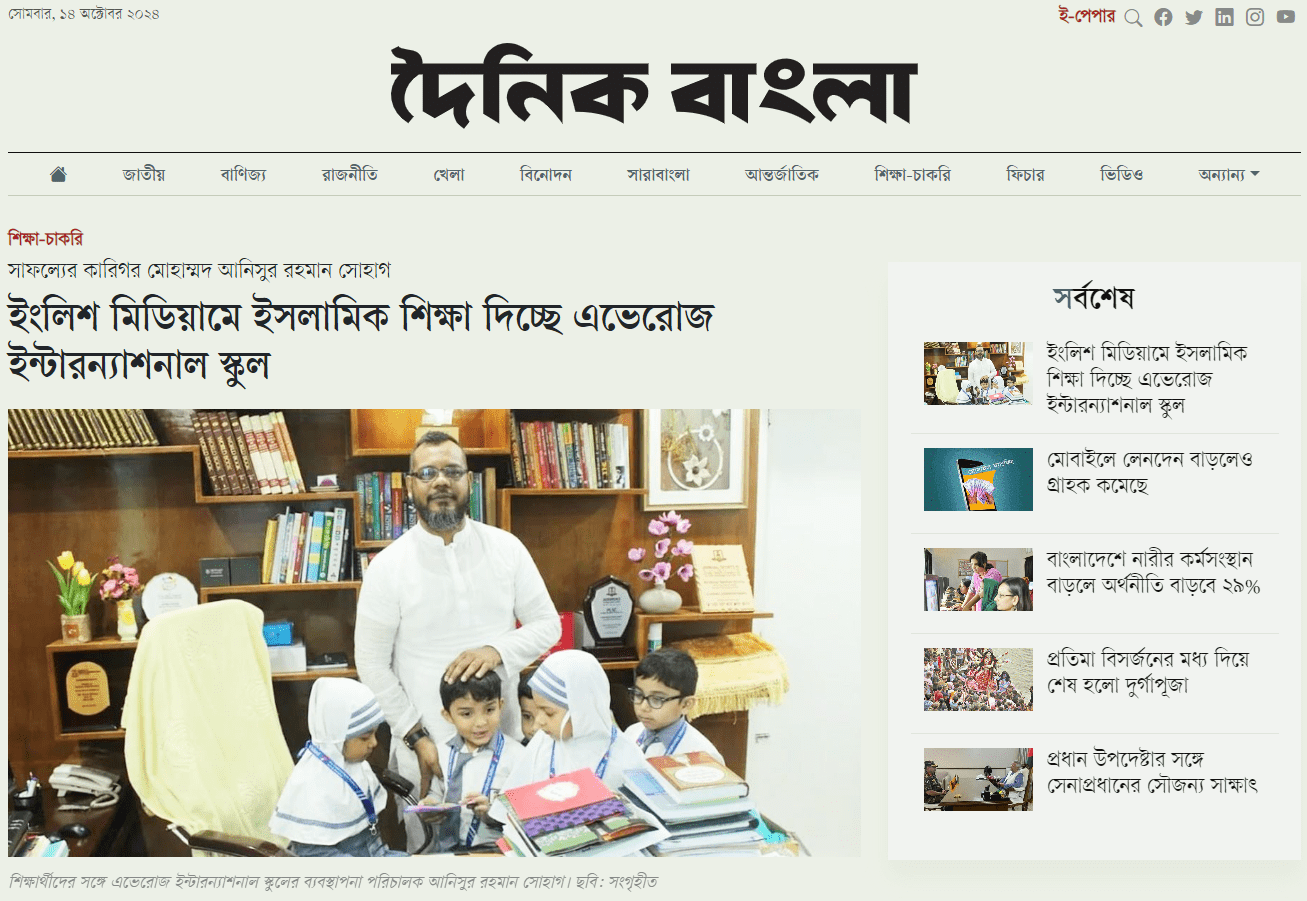 শিক্ষার্থীদের পূর্ণাঙ্গ মানুষ হিসেবে গড়ে তুলছে এভেরোজ ইন্টারন্যাশনাল স্কুল Publisher : Bangladesh Pratidin Publish Date : 14 October, 2024 Read Full Article Read Full Article