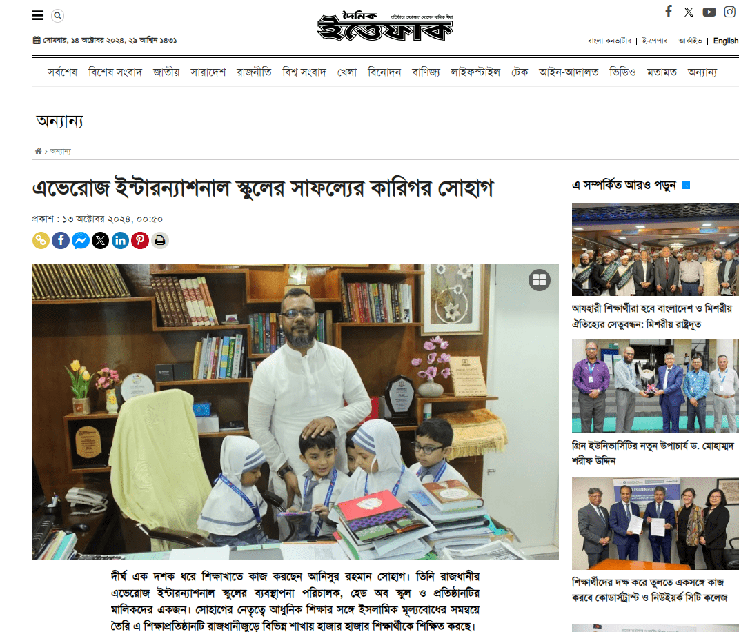 এভেরোজ ইন্টারন্যাশনাল স্কুলের সাফল্যের পেছনে আনিসুর রহমান সোহাগ Publisher : The New Vision Publish Date : 14 October, 2024 Read Full Article Read Full Article