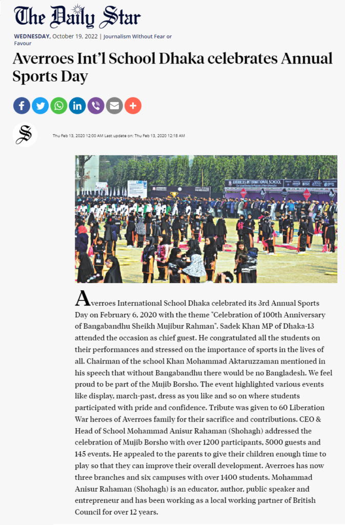 Averroes Int’l School Dhaka celebrates Annual Sports Day Publisher : THE DAILY STAR Publish Date : 13/02/2020 Read Full Article Read Full Article