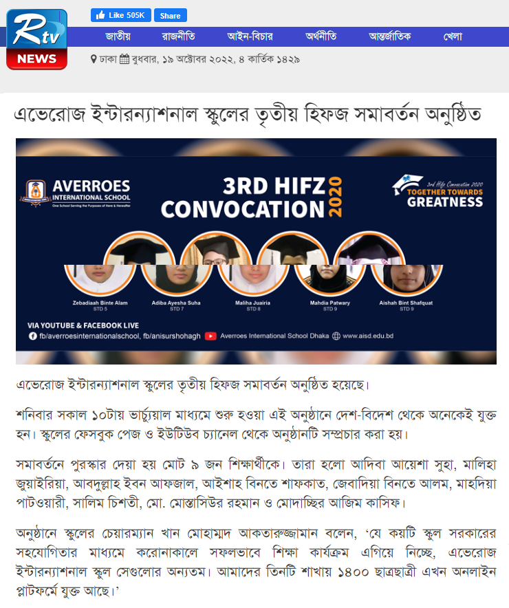 এভেরোজ ইন্টারন্যাশনাল স্কুলের তৃতীয় হিফজ সমাবর্তন অনুষ্ঠিত Publisher : RTV News Publish Date : 05/09/2020 Read Full Article Read Full Article