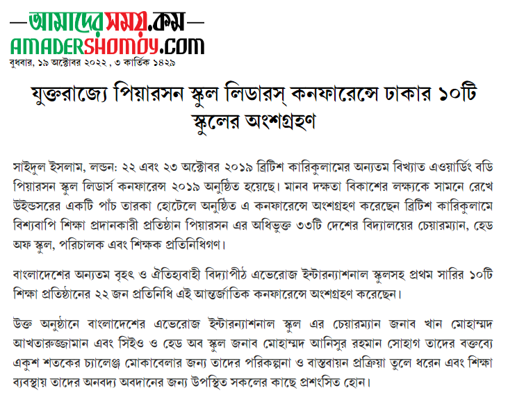 যুক্তরাজ্যে পিয়ারসন স্কুল লিডারস্ কনফারেন্সে ঢাকার ১০টি স্কুলের অংশগ্রহণ Publisher : AMADERSHOMOY.COM Publish Date : 29/10/2019 Read Full Article Read Full Article