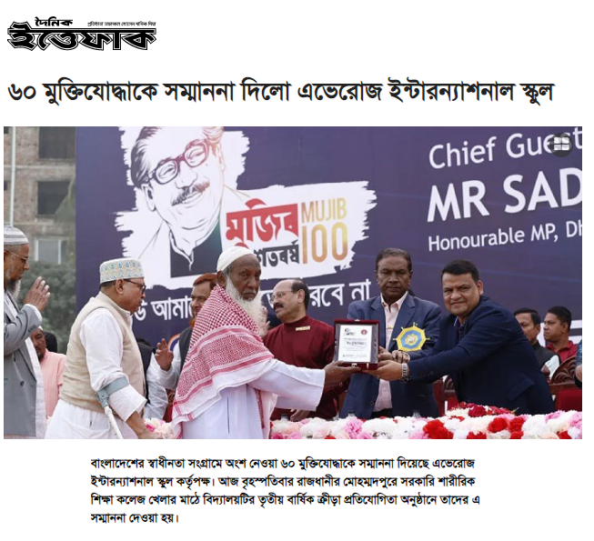 ৬০ মুক্তিযোদ্ধাকে সম্মাননা দিলো এভেরোজ ইন্টারন্যাশনাল স্কুল Publisher : দৈনিক ইত্তেফাক Publish Date : 06/02/2020 Read Full Article Read Full Article